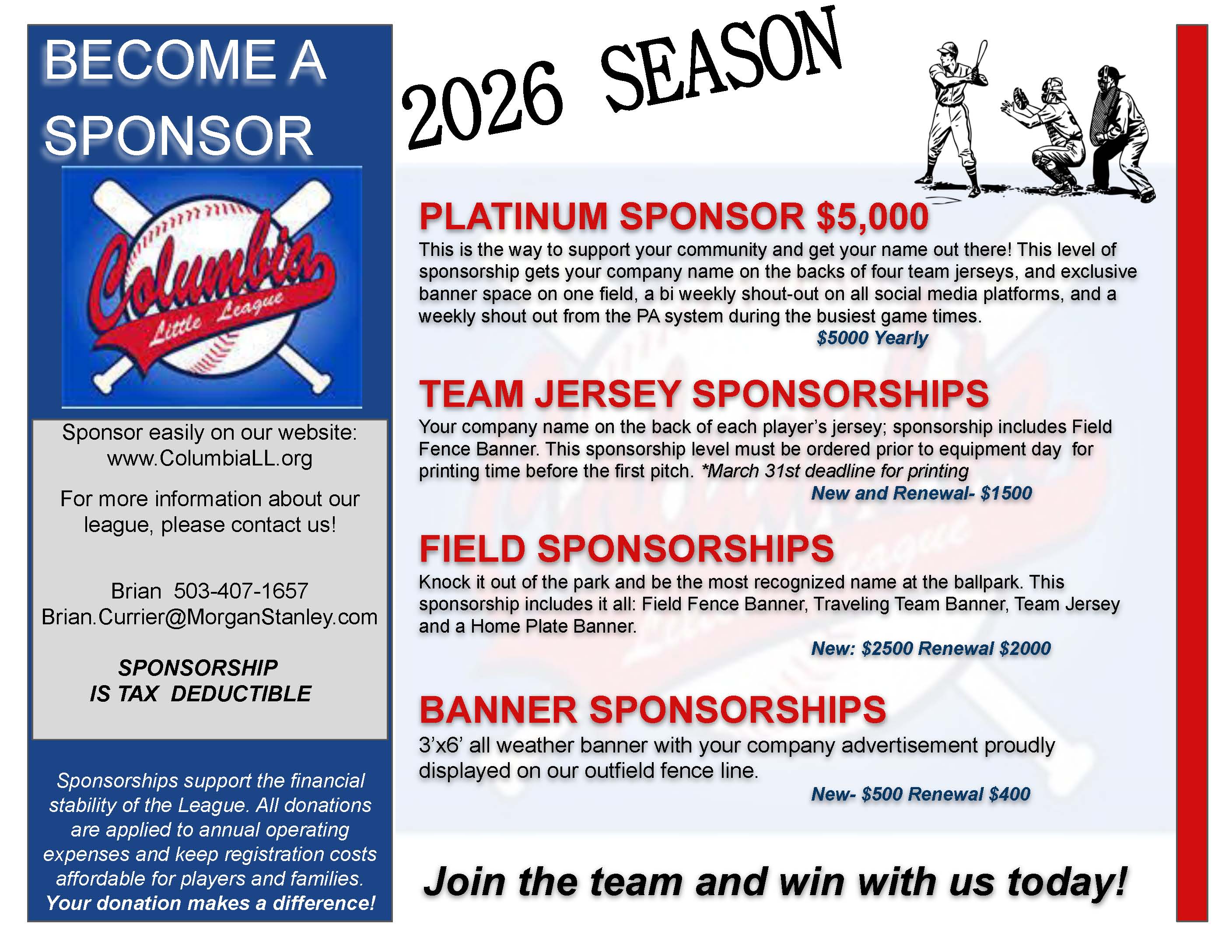 Thank you so much for your support! BUSINESS SPONSORSHIP PACKAGESField Banner (new) $500 (renewal) $4003'x6' all-weather banner with company advertisement proudly displayed on our outfield fence lines. Team Jersey (new and renewal) $1500Your company name on the back of each player's jersey; This sponsorship includes includes Field Fence Banner. Field Sponsorship (new) $2500 (renewal) $2000Be the most prominent sponsor on the field! This sponsorship includes it all: Field Banners, Team Jersey, AND a Home Plate Banner! Platinum Sponsorship (new) $2500 (renewal) $2000This is the way to support your community and get your name out there! This level ofsponsorship gets your company name on the backs of four team jerseys, and exclusivebanner space on one field, a bi weekly shout-out on all social media platforms, and aweekly shout out from the PA system during the busiest game times.Please click here to donate or sponsor